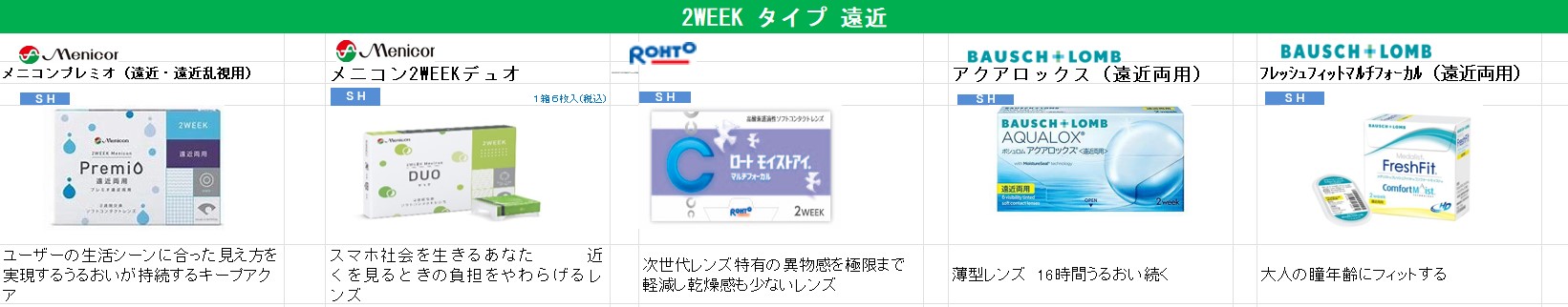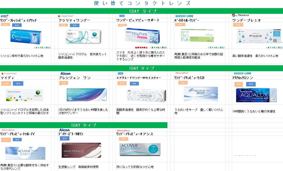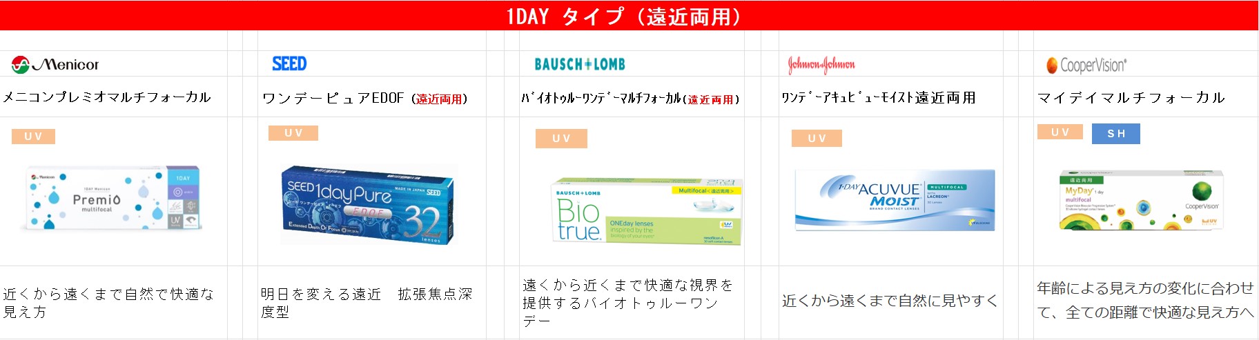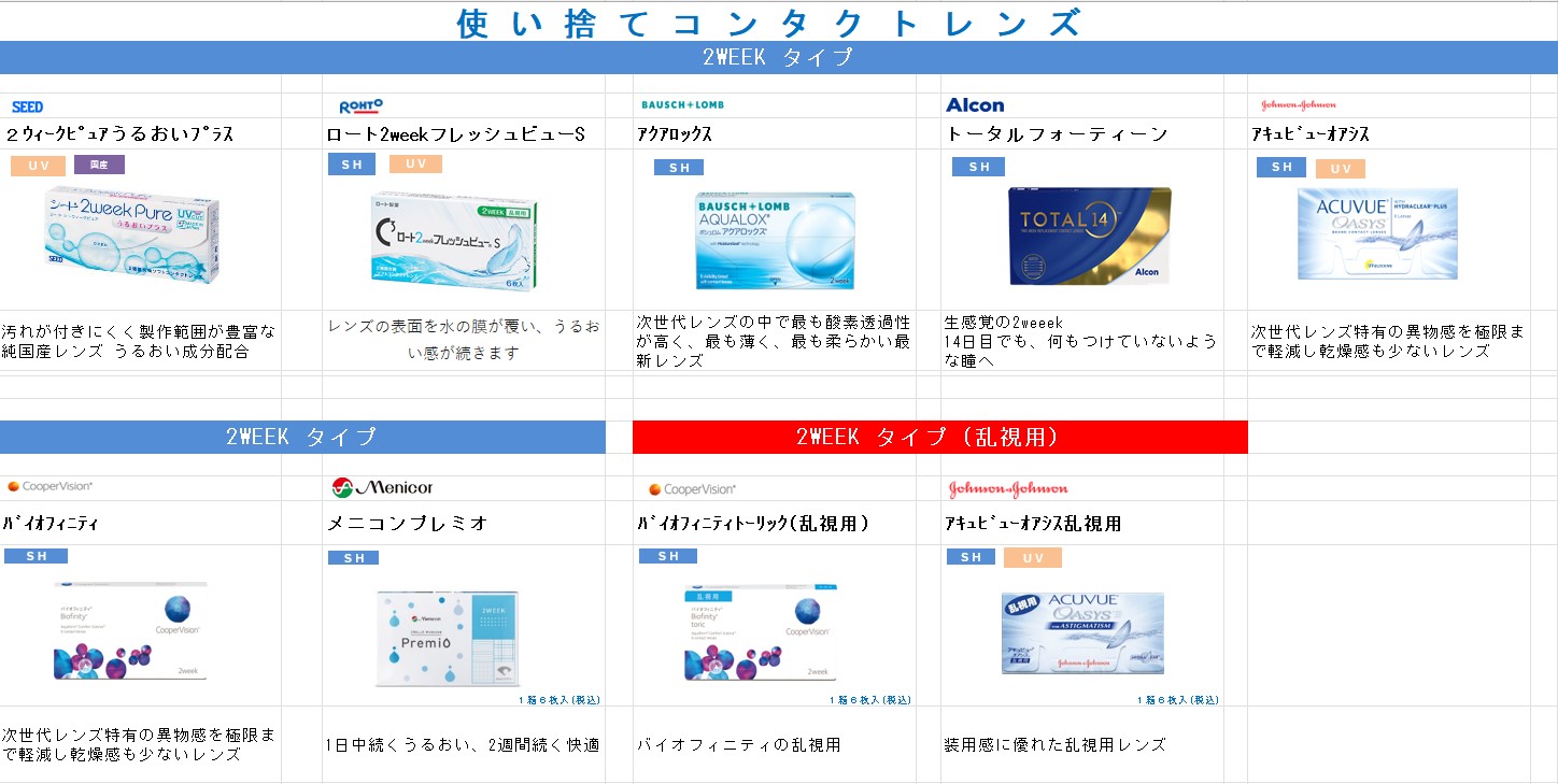 (2,600 – 3,700円/6枚入り 遠近両用:3,300 – 4,000円/6枚入り)