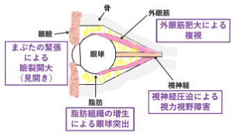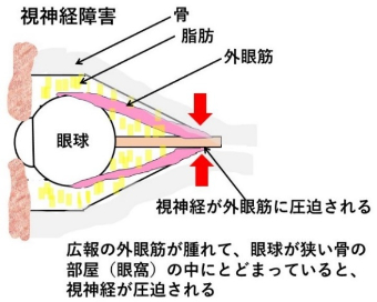 外眼筋炎が進行すると、視神経を圧迫して視神経障害を起こします。視神経障害が起きると、視野が欠け、視力が低下してしまいます。至急圧迫を取り除くためのステロイド注射、それが有効でない場合は手術を行います。