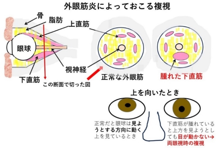 人の眼球には片眼に6本ずつ合計12本の外眼筋があり、両眼の眼球運動をバランスよく行います。一部の外眼筋に炎症が起こると、その筋が働く方向への眼球の動きが悪くなります。この変化は初めは周辺を見た時だけに起こり、複視を生じます。進行すると正面を見た時にも複視を自覚するようになります。